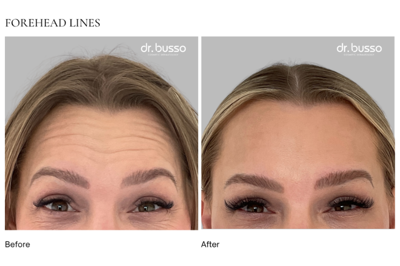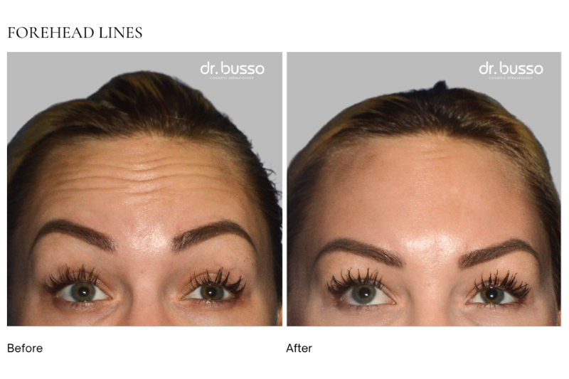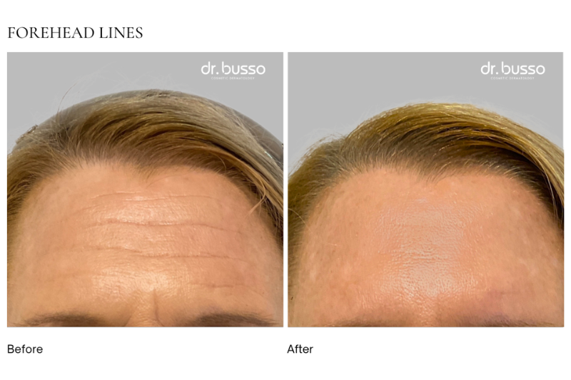 This patient sought to address forehead lines. Because the wrinkles appeared solely by movement, Dr. Busso used Botox to relax the corresponding muscles, resulting in the smoothing of her …