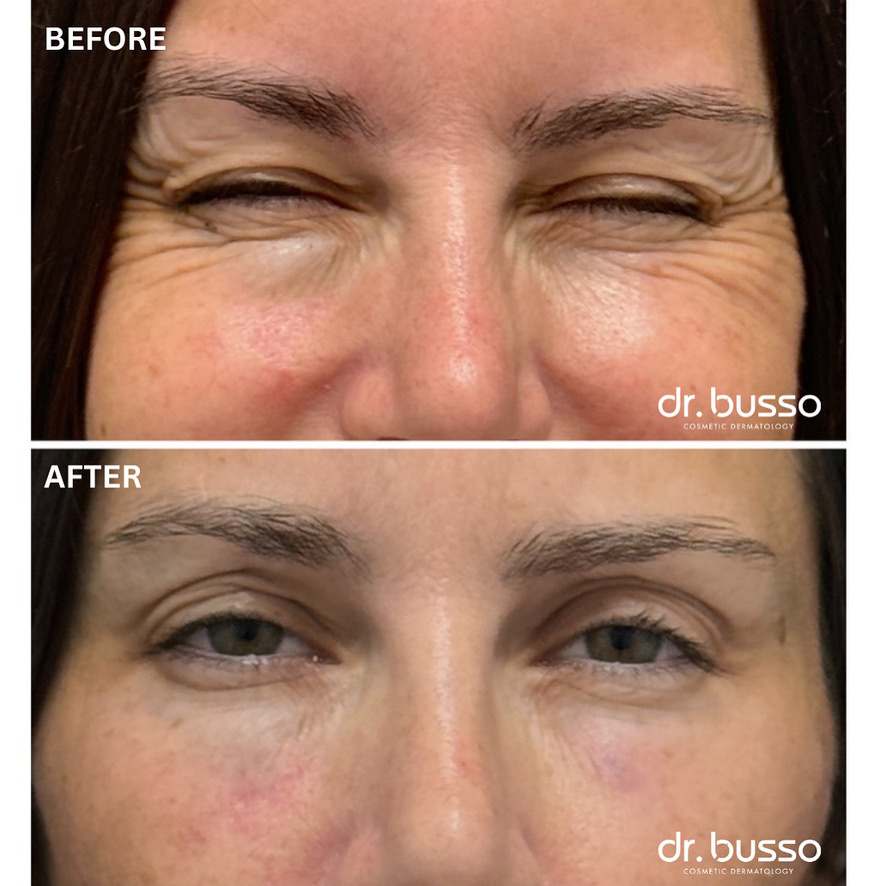A female patient sought treatment for her crow’s feet, the fine lines that had developed around her outer eyes due to aging. Concerned about their impact on her appearance, she visited Dr. Busso for a solution that would provide a more youthful look without surgery.