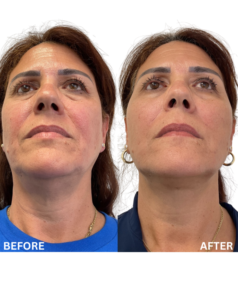 This patient received the BussoLyft using PDO threads to address skin laxity and tissue descent in the cheeks, jowls, and neck. Threads were placed to reposition and support the underlying tissue, resulting in a visibly firmer and more lifted appearance across the lower face and neck.