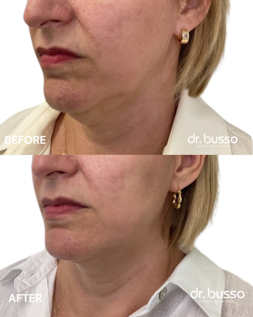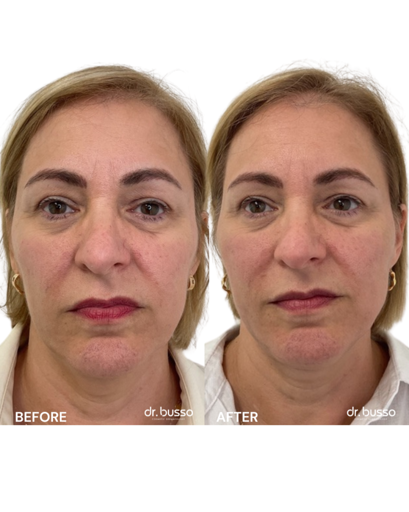 This patient underwent Dr. Busso’s BussoLyft technique to improve skin laxity and redefine facial contours. PDO threads were placed in the cheeks, jowls, and neck to lift and restore structural support. The procedure resulted in improved contour and a more defined appearance through the mid and lower face.